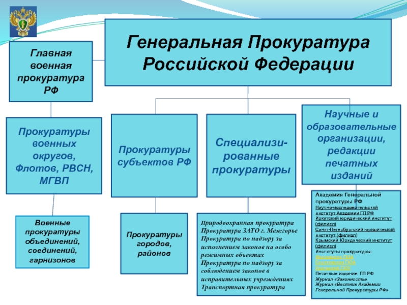 Прокуратура Российской Федерации является единой централизованной системой органов и учреждений с подчинением нижестоящих прокуроров вышестоящим и генеральному прокурору Российской Федерации, в которую входят: