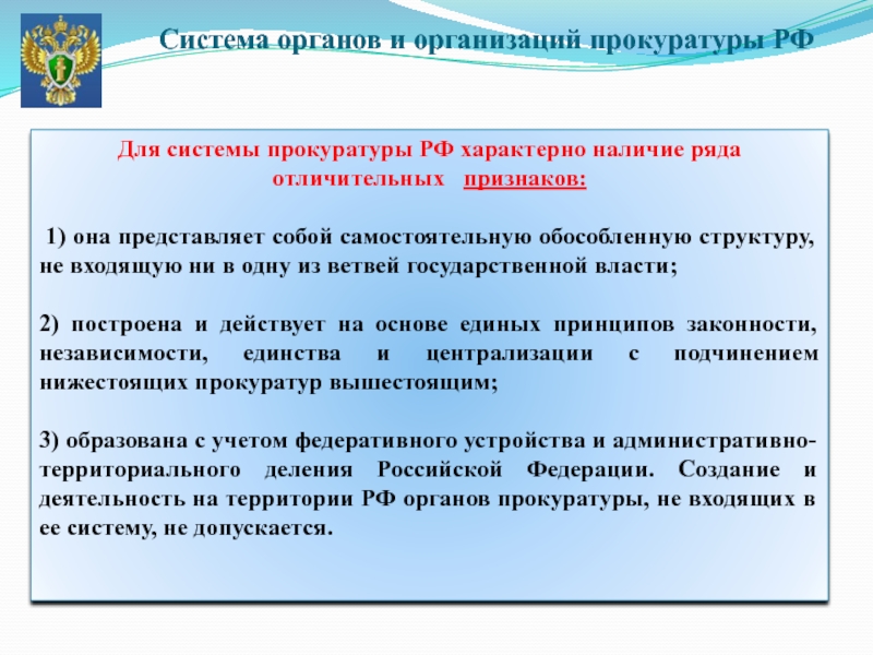 Слайд 6Для системы прокуратуры РФ характерно наличие ряда отличительных признаков: