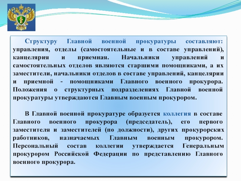 являются старшими помощниками, а их заместители, начальники отделов в составе управлений, канцелярии и приемной - помощниками Главного военного прокурора. Положения о структурных подразделениях Главной военной прокуратуры утверждаются Главным военным прокурором.