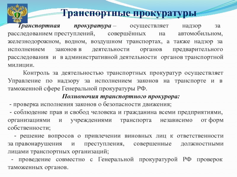 Транспортная прокуратура – осуществляет надзор за расследованием преступлений, совершённых на
