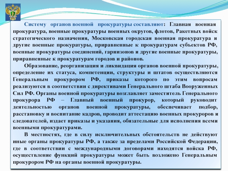 Образование, реорганизация и ликвидация органов военной прокуратуры, определение их статуса, компетенции, структуры и штатов осуществляются Генеральным прокурором РФ, приказы которого по этим вопросам реализуются в соответствии с директивами Генерального штаба Вооруженных Сил РФ. Органы военной прокуратуры возглавляет заместитель Генерального прокурора РФ – Главный военный прокурор, который руководит деятельностью органов военной прокуратуры, обеспечивает подбор, расстановку и воспитание кадров, проводит аттестацию военных прокуроров и следователей, издает приказы и указания, обязательные для исполнения всеми военными прокуратурами.