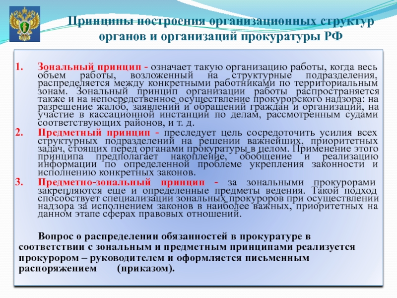 Вопрос о распределении обязанностей в прокуратуре в соответствии с зональным и предметным принципами реализуется прокурором – руководителем и оформляется письменным распоряжением (приказом).