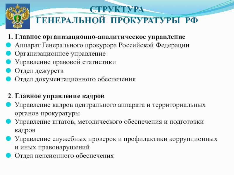 2. Генеральный прокурор РФ в пределах выделенной штатной численности и фонда оплаты труда устанавливает штаты и структуру Генеральной прокуратуры РФ, определяет полномочия структурных подразделений, устанавливает штатную численность и структуру подчиненных органов и организаций прокуратуры.