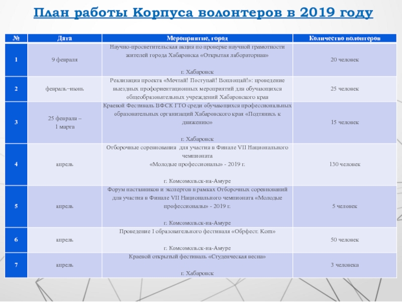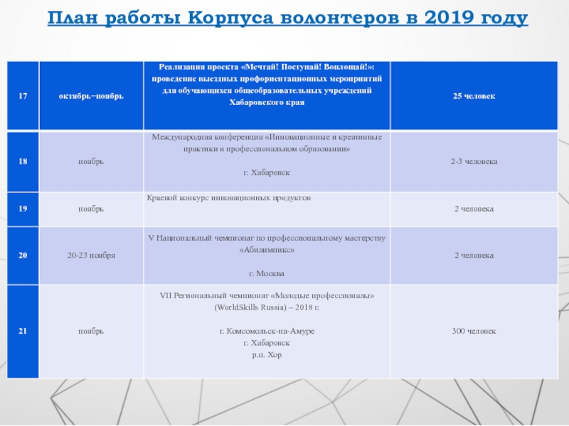 Слайд 4План работы Корпуса волонтеров в 2019 году