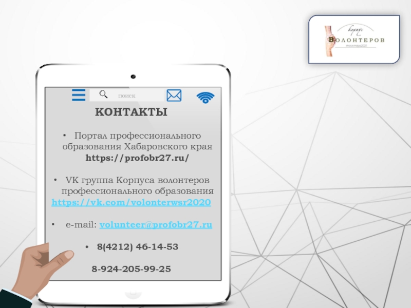 КОНТАКТЫПортал профессионального образования Хабаровского края https://profobr27.ru/VK группа Корпуса волонтеров профессионального образованияhttps://vk.com/volonterwsr2020 e-mail: volunteer@profobr27.ru8(4212) 46-14-538-924-205-99-25поиск