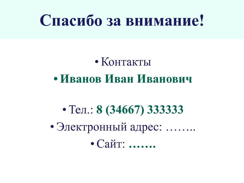 Спасибо за внимание!КонтактыИванов Иван ИвановичТел.: 8 (34667) 333333Электронный адрес: ……..Сайт: …….