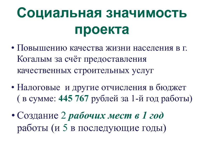 Социальная значимость проектаПовышению качества жизни населения в г. Когалым за счёт предоставления качественных строительных услугНалоговые и другие