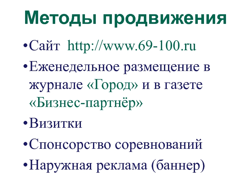 Сайт http://www.69-100.ruЕженедельное размещение в журнале «Город» и в газете «Бизнес-партнёр»ВизиткиСпонсорство соревнованийНаружная реклама (баннер)Методы продвижения