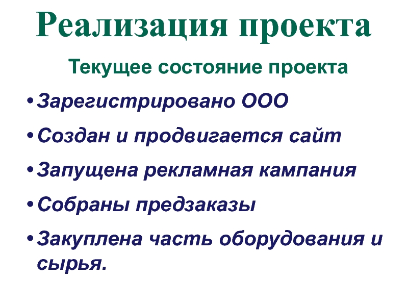 Реализация проектаТекущее состояние проектаЗарегистрировано ОООСоздан и продвигается сайтЗапущена рекламная кампанияСобраны предзаказы Закуплена часть оборудования и сырья.