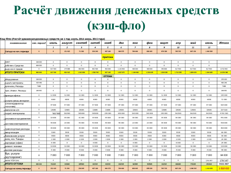 Слайд 14Расчёт движения денежных средств (кэш-фло)