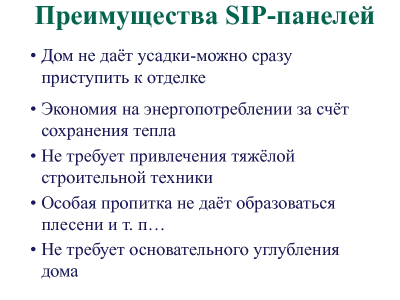 Преимущества SIP-панелей Дом не даёт усадки-можно сразу приступить к отделкеЭкономия на энергопотреблении за счёт сохранения теплаНе требует