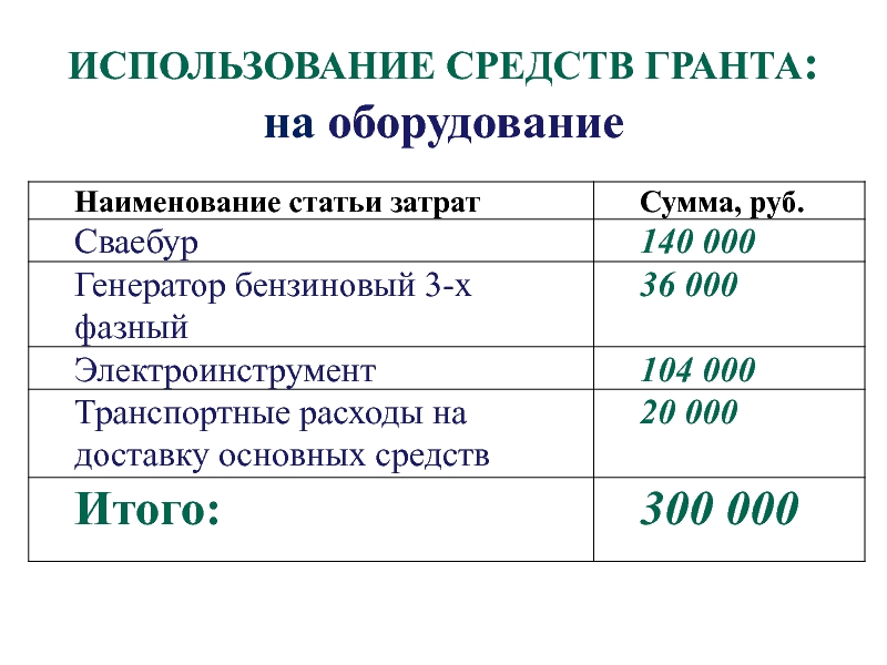 ИСПОЛЬЗОВАНИЕ СРЕДСТВ ГРАНТА: на оборудование