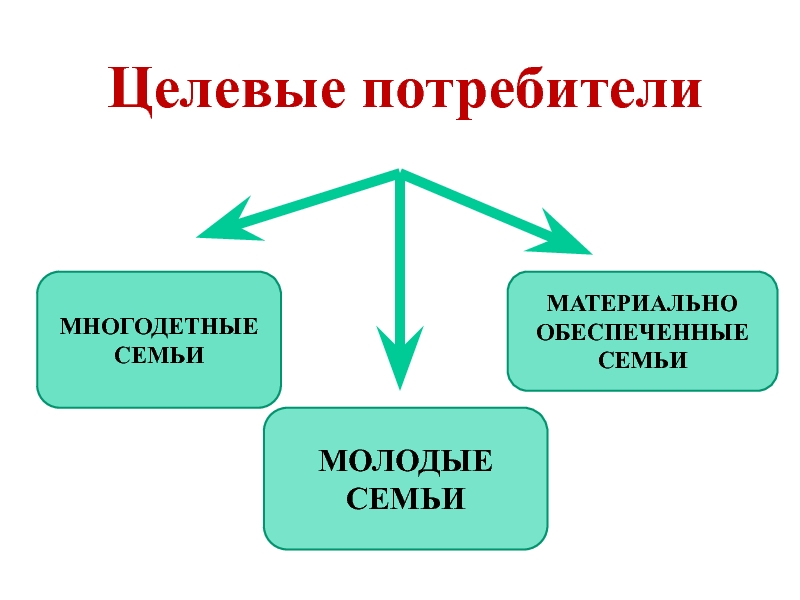 Целевые потребителиМНОГОДЕТНЫЕ СЕМЬИМОЛОДЫЕ СЕМЬИМАТЕРИАЛЬНО ОБЕСПЕЧЕННЫЕ СЕМЬИ