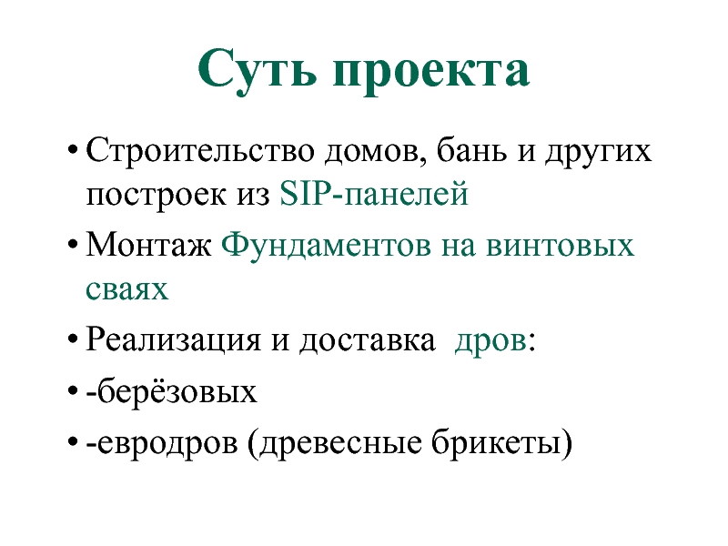 Суть проектаСтроительство домов, бань и других построек из SIP-панелейМонтаж Фундаментов на винтовых сваяхРеализация и доставка дров: -берёзовых-евродров (древесные брикеты)