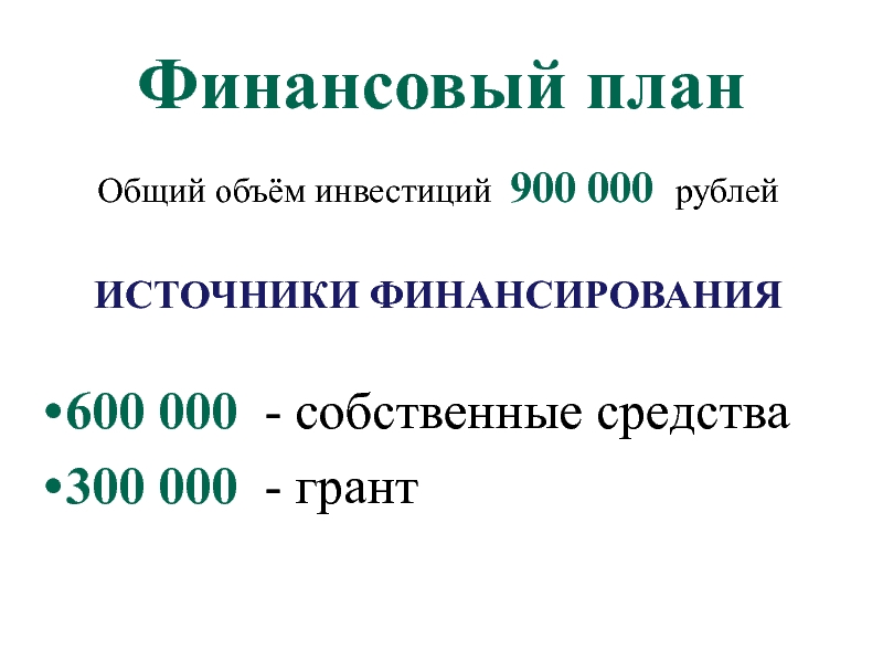 Финансовый планОбщий объём инвестиций 900 000 рублейИСТОЧНИКИ ФИНАНСИРОВАНИЯ600 000 - собственные средства300 000 - грант