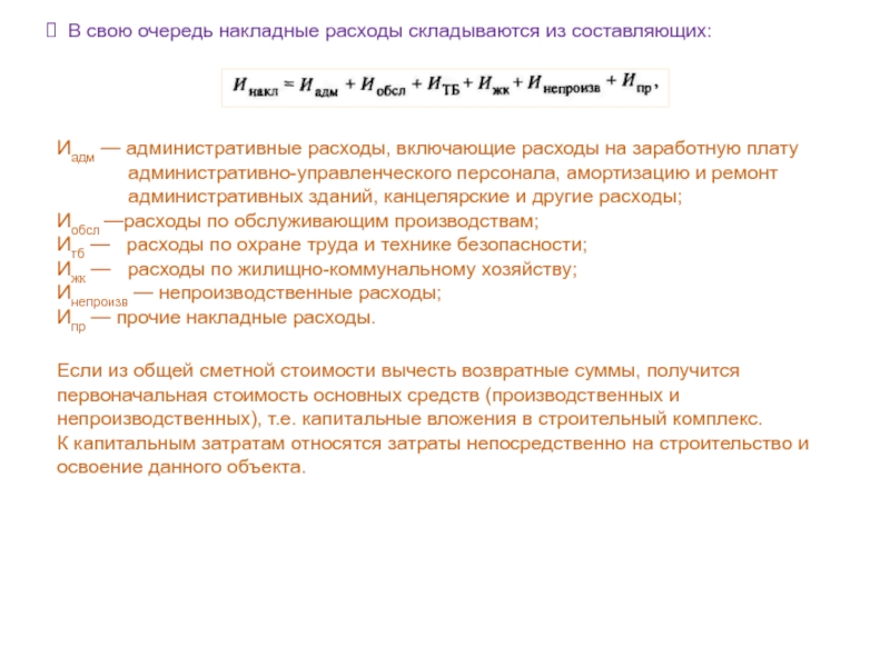 Если из общей сметной стоимости вычесть возвратные суммы, получится первоначальная стоимость основных средств (производственных и непроизводственных), т.е. капитальные вложения в строительный комплекс.