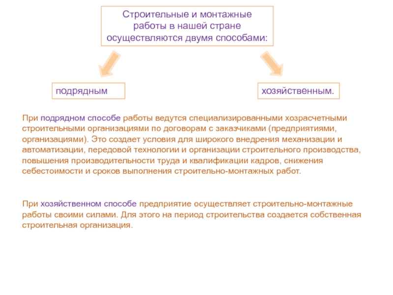 При хозяйственном способе предприятие осуществляет строительно-монтажные работы своими силами. Для этого на период строительства создается собственная строительная организация.