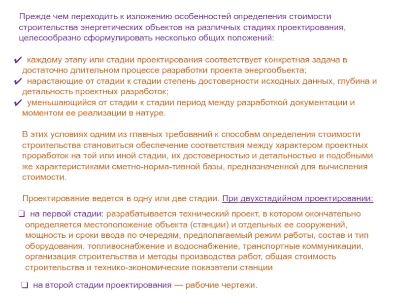 на первой стадии: разрабатывается технический проект, в котором окончательно определяется местоположение объекта (станции) и отдельных ее сооружений, мощность и сроки ввода по очередям, предполагаемый режим работы, состав и тип оборудования, топливоснабжение и водоснабжение, транспортные коммуникации, организация строительства и методы производства работ, общая стоимость строительства и технико-экономические показатели станции