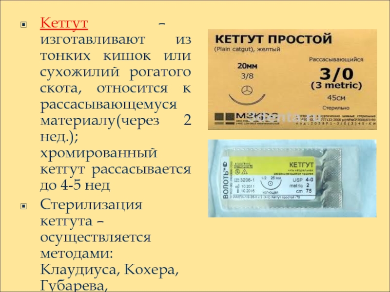 Слайд 14Кетгут – изготавливают из тонких кишок или сухожилий рогатого скота,