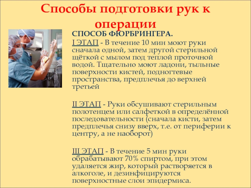 III ЭТАП - В течение 5 мин руки обрабатывают 70% спиртом, при этом удаляется жир, который растворяется в алкоголе, и дезинфицируются поверхностные слои эпидермиса.