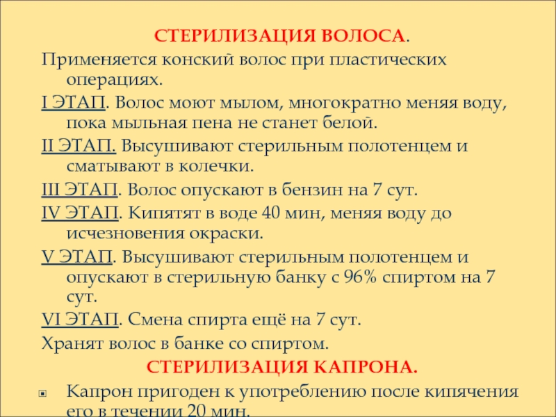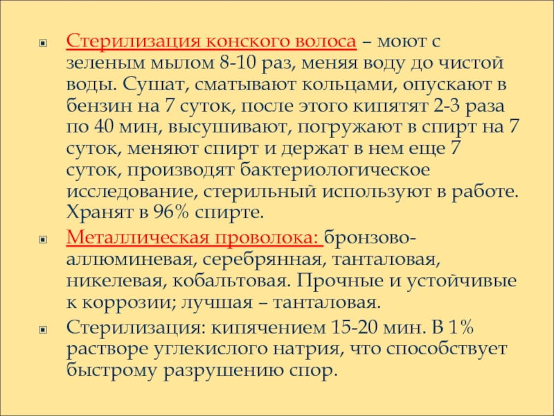 Слайд 16Стерилизация конского волоса – моют с зеленым мылом 8-10 раз,
