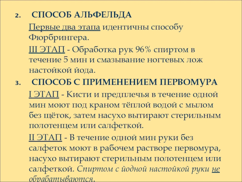 II ЭТАП - В течение одной мин руки без салфеток моют в рабочем растворе первомура, насухо вытирают стерильным полотенцем или салфеткой. Спиртом с йодной настойкой руки не обрабатываются.