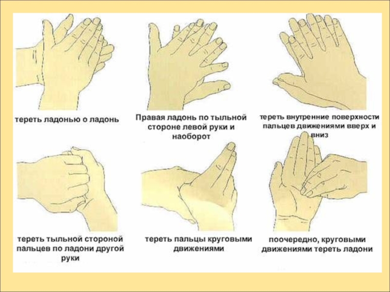 с мылом под теплой проточной водой. Тщательно моют ладони, тыльные поверхности кистей, подногтевые пространства, предплечья до верхней третьей