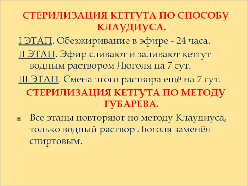 Стерилизация кетгута – осуществляется методами: Клаудиуса, Кохера, Губарева, Ситковского