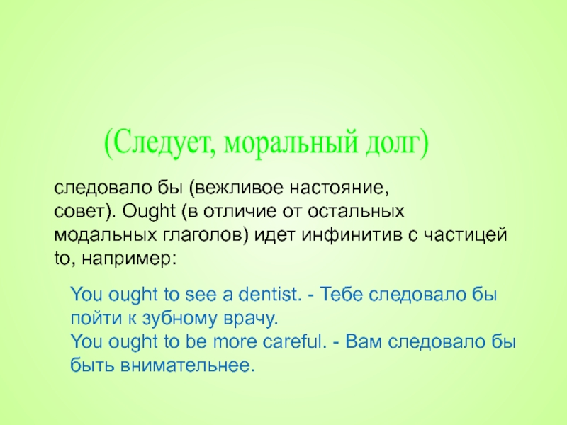 следовало бы (вежливое настояние, совет). Оught (в отличие от остальных модальных глаголов) идет инфинитив с частицей to, например:
