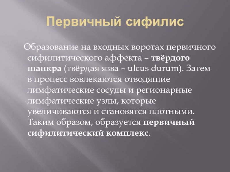 процесс вовлекаются отводящие лимфатические сосуды и регионарные лимфатические узлы, которые увеличиваются и становятся плотными. Таким образом, образуется первичный сифилитический комплекс.