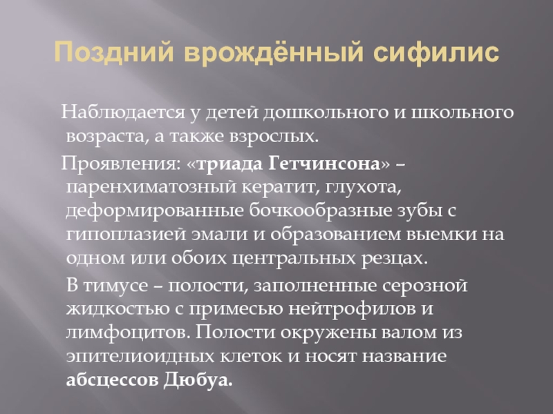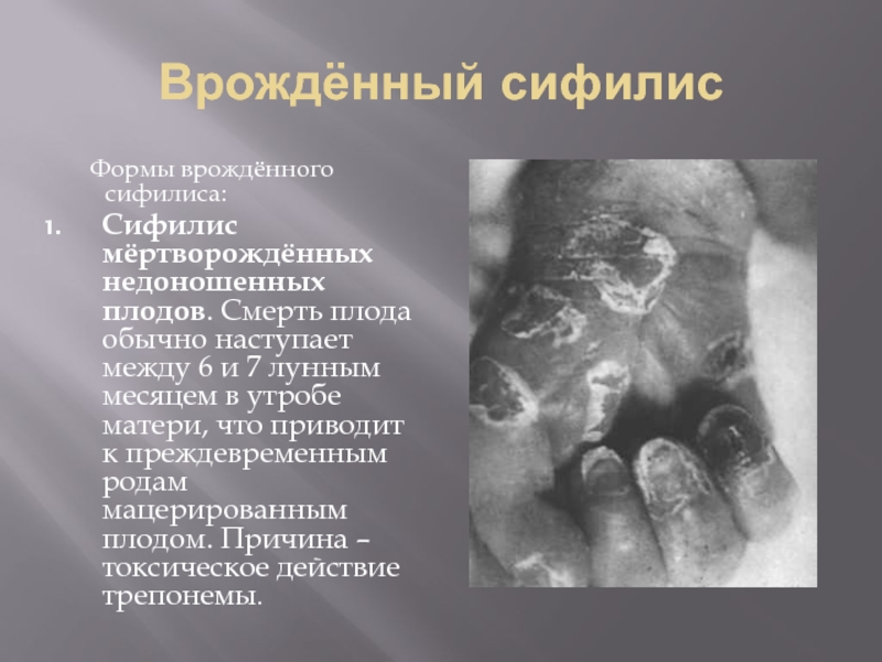 утробе матери, что приводит к преждевременным родам мацерированным плодом. Причина – токсическое действие трепонемы.