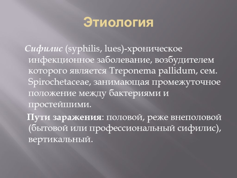 Пути заражения: половой, реже внеполовой (бытовой или профессиональный сифилис), вертикальный.