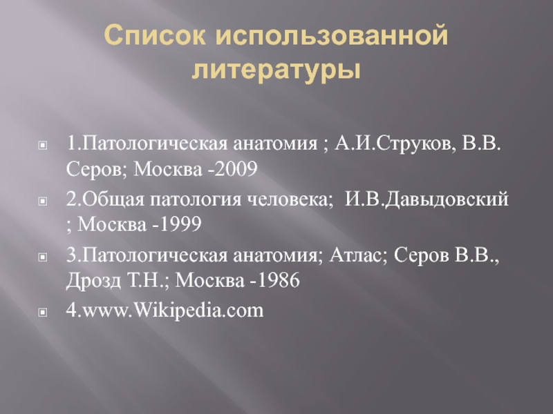 1.Патологическая анатомия ; А.И.Струков, В.В.Серов; Москва -2009