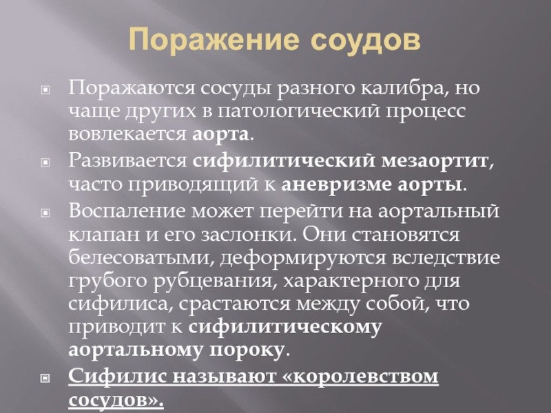 Развивается сифилитический мезаортит, часто приводящий к аневризме аорты.