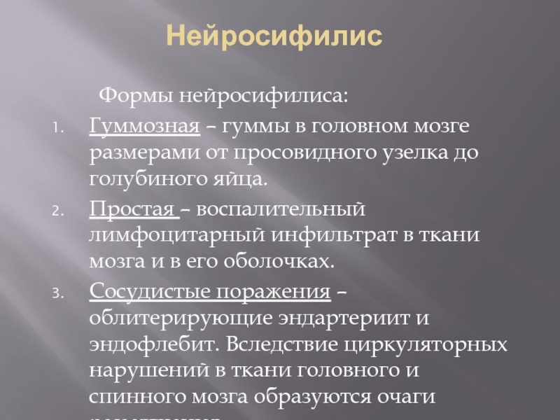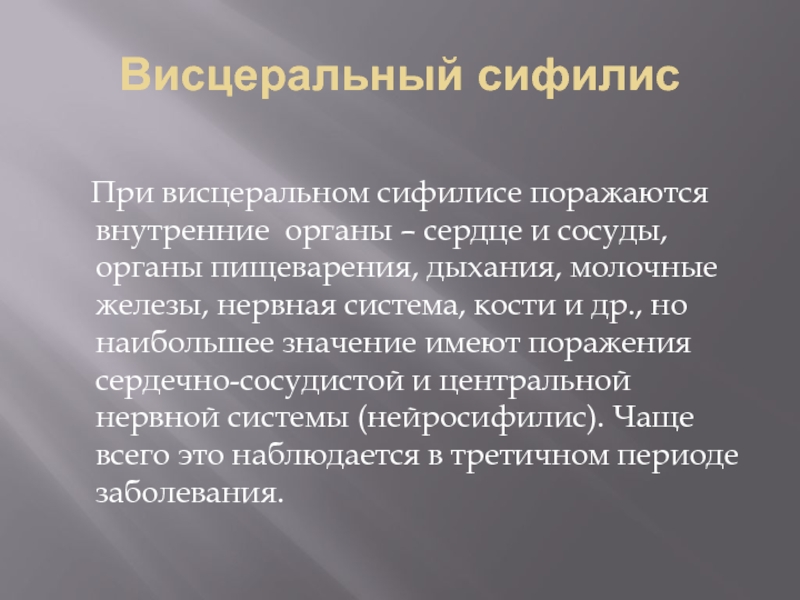кости и др., но наибольшее значение имеют поражения сердечно-сосудистой и центральной нервной системы (нейросифилис). Чаще всего это наблюдается в третичном периоде заболевания.