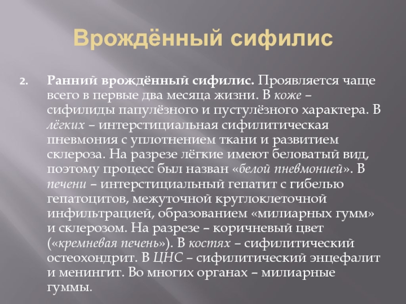 В лёгких – интерстициальная сифилитическая пневмония с уплотнением ткани и развитием склероза. На разрезе лёгкие имеют беловатый вид, поэтому процесс был назван «белой пневмонией». В печени – интерстициальный гепатит с гибелью гепатоцитов, межуточной круглоклеточной инфильтрацией, образованием «милиарных гумм» и склерозом. На разрезе – коричневый цвет («кремневая печень»). В костях – сифилитический остеохондрит. В ЦНС – сифилитический энцефалит и менингит. Во многих органах – милиарные гуммы.