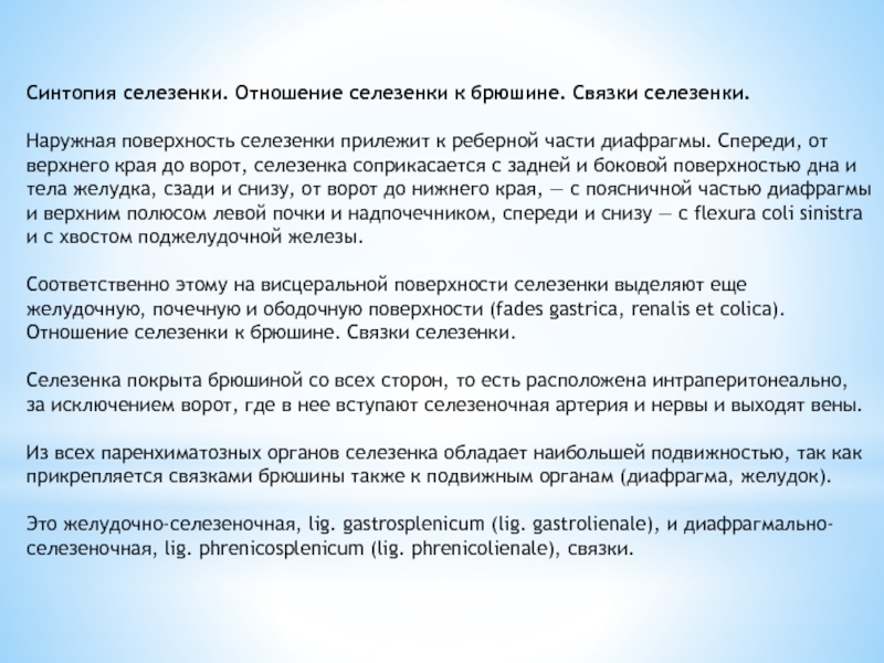 Из всех паренхиматозных органов селезенка обладает наибольшей подвижностью, так как прикрепляется связками брюшины также к подвижным органам (диафрагма, желудок).