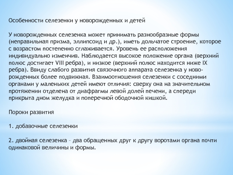строение, которое с возрастом постепенно сглаживается. Уровень ее расположения индивидуально изменчив. Наблюдается высокое положение органа (верхний полюс достигает VIII ребра), и низкое (верхний полюс находится ниже IX ребра). Ввиду слабого развития связочного аппарата селезенка у ново-рожденных более подвижная. Взаимоотношения селезенки с соседними органами у маленьких детей имеют отличия: сверху она на значительном протяжении отделена от диафрагмы левой долей печени, а спереди прикрыта дном желудка и поперечной ободочной кишкой.