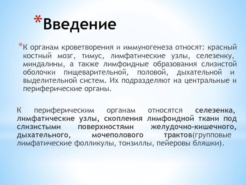 К периферическим органам относятся селезенка, лимфатические узлы, скопления лимфоидной ткани под слизистыми поверхностями желудочно-кишечного, дыхательного, мочеполового трактов(групповые лимфатические фолликулы, тонзиллы, пейеровы бляшки).