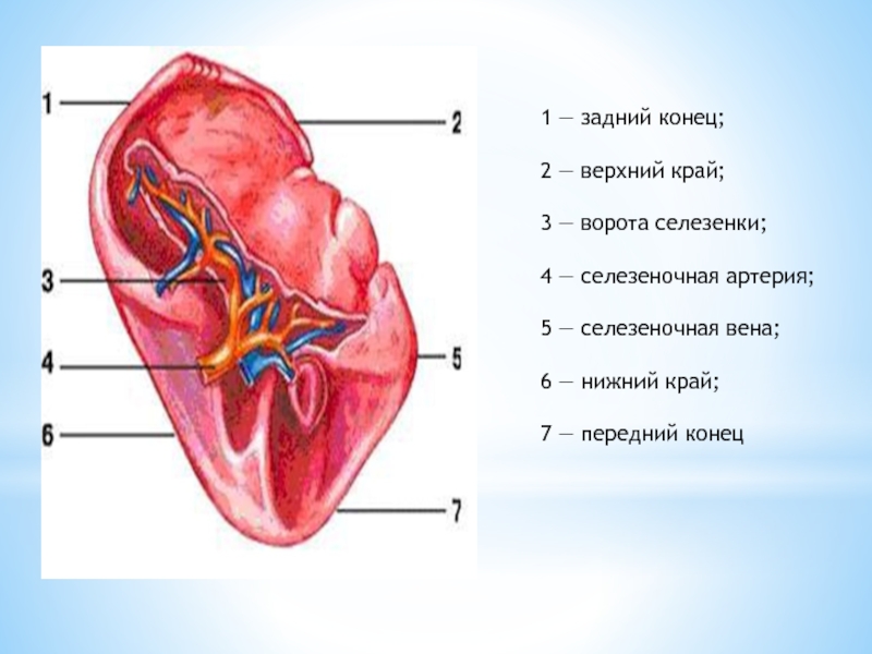 7 — почечная поверхность селезенки;