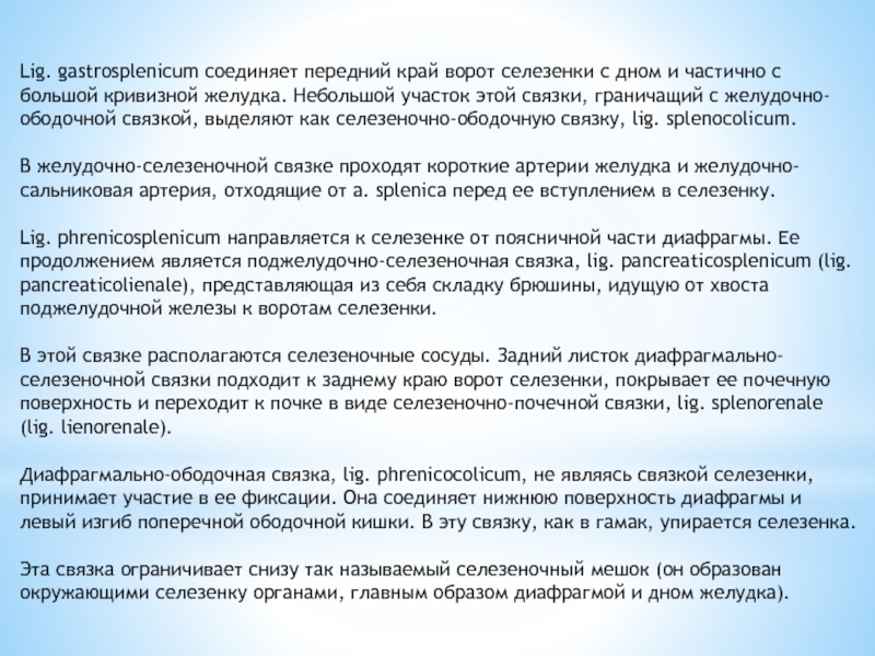 Lig. gastrosplenicum соединяет передний край ворот селезенки с дном и