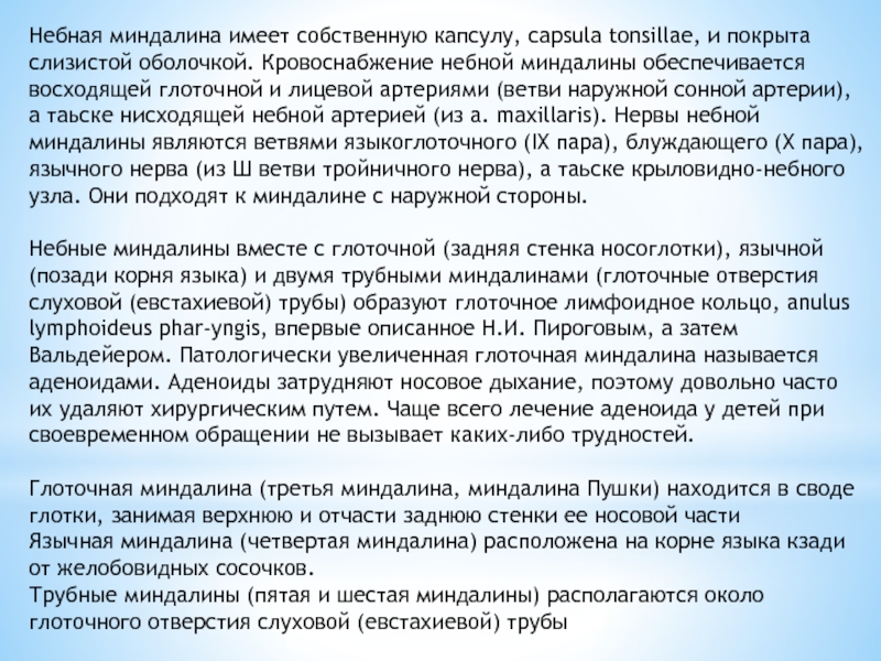 (ветви наружной сонной артерии), а таьске нисходящей небной артерией (из a. maxillaris). Нервы небной миндалины являются ветвями языкоглоточного (IX пара), блуждающего (X пара), язычного нерва (из Ш ветви тройничного нерва), а таьске крыловидно-небного узла. Они подходят к миндалине с наружной стороны.