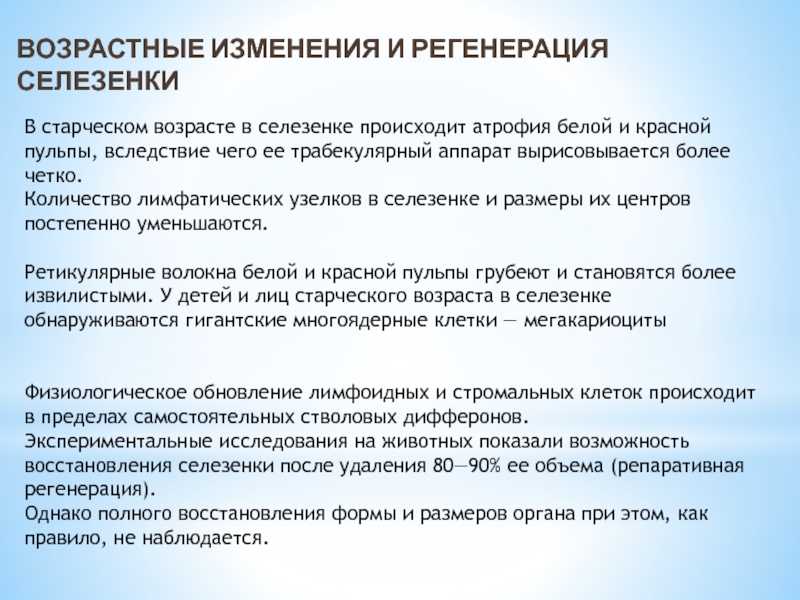 Слайд 15Возрастные изменения и регенерация селезенки