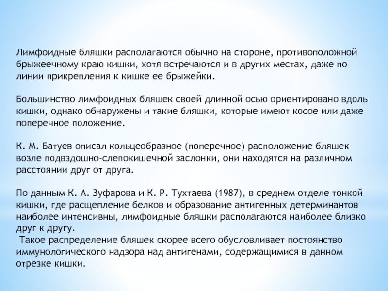 По данным К. А. Зуфарова и К. Р. Тухтаева (1987), в среднем отделе тонкой кишки, где расщепление белков и образование антигенных детерминантов наиболее интенсивны, лимфоидные бляшки располагаются наиболее близко друг к другу.