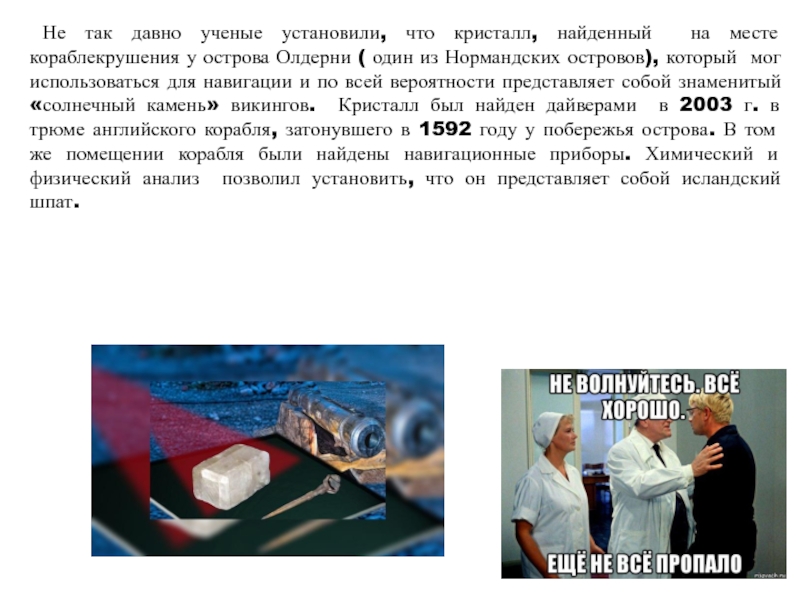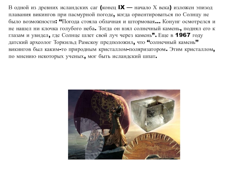 ориентироваться по Солнцу не было возможности: “Погода стояла облачная и штормовая... Конунг осмотрелся и не нашел ни клочка голубого неба. Тогда он взял солнечный камень, поднял его к глазам и увидел, где Солнце шлет свой луч через камень”. Еще в 1967 году датский археолог Торкильд Рамскоу предположил, что “солнечный камень” викингов был каким-то природным кристаллом-поляризатором. Этим кристаллом, по мнению некоторых ученых, мог быть исландский шпат.