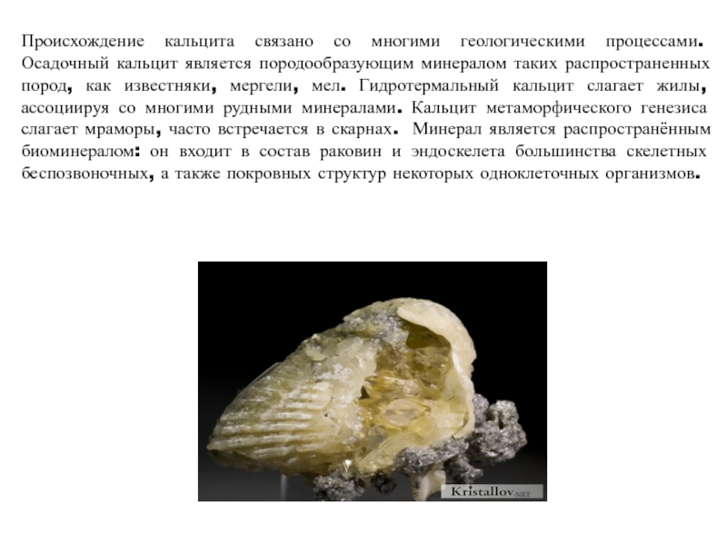 Слайд 6Происхождение кальцита связано со многими геологическими процессами. Осадочный кальцит является