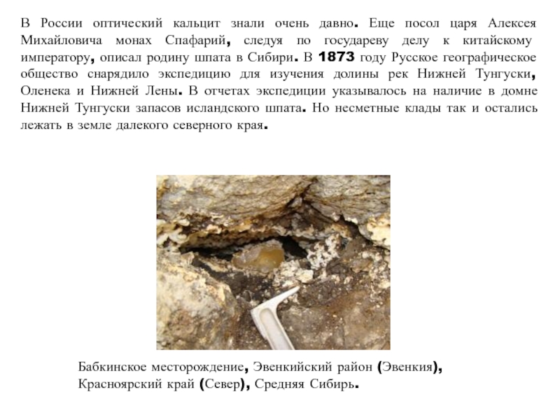 императору, описал родину шпата в Сибири. В 1873 году Русское географическое общество снарядило экспедицию для изучения долины рек Нижней Тунгуски, Оленека и Нижней Лены. В отчетах экспедиции указывалось на наличие в домне Нижней Тунгуски запасов исландского шпата. Но несметные клады так и остались лежать в земле далекого северного края.