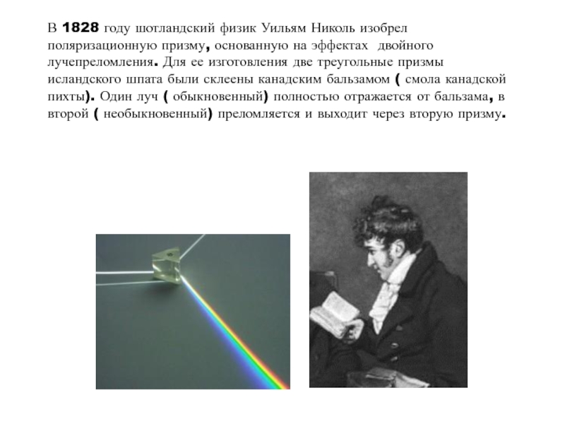 Слайд 20В 1828 году шотландский физик Уильям Николь изобрел поляризационную призму,