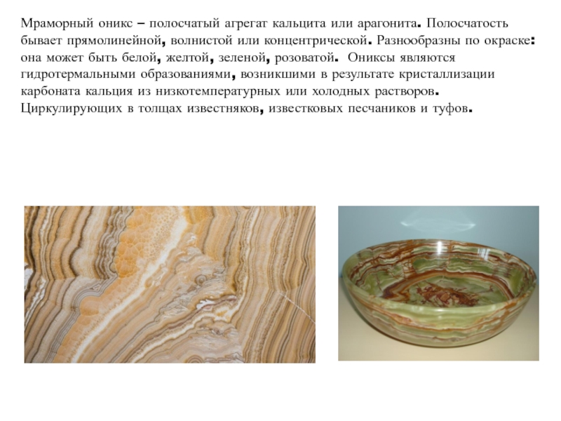Слайд 23Мраморный оникс – полосчатый агрегат кальцита или арагонита. Полосчатость бывает