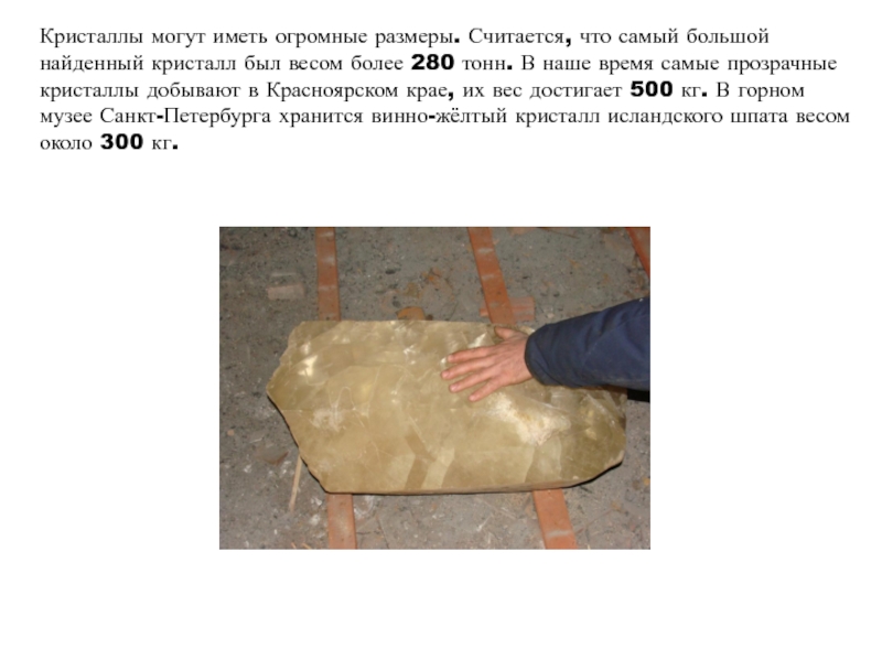 прозрачные кристаллы добывают в Красноярском крае, их вес достигает 500 кг. В горном музее Санкт-Петербурга хранится винно-жёлтый кристалл исландского шпата весом около 300 кг.